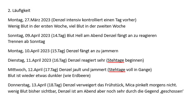 Ich habe euch mal einen Ausschnitt aus dem Läufigkeitstagebuch eingestellt. Wie man lesen kann, alles im ‘grünen’ Bereich. Ich schaue immer mal wieder rein, wahrscheinlich um mich selbst zu beruhigen. Die beiden sind noch total entspannt miteinander, was auffällt, ist das Mica jetzt wirklich sichtbar blutet und der Denzel sie oft überprüft und von ihrem Pipi fast nicht weg zu bekommen ist. Naja wir gehen jetzt mal Fährten und schauen, was der morgige Test bringt. Ich sage nur ”Ohmmmmm’