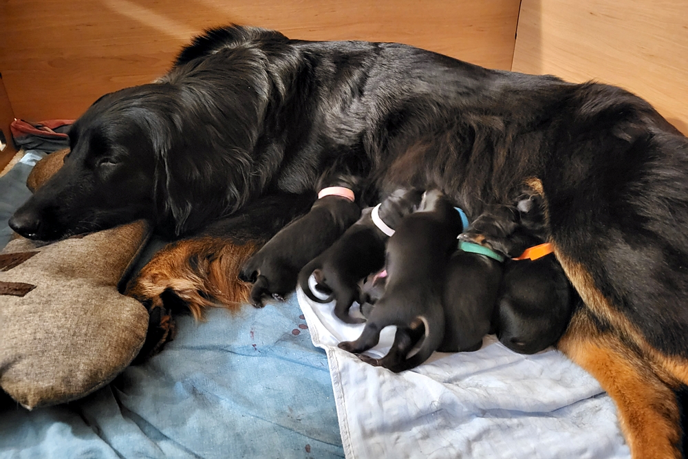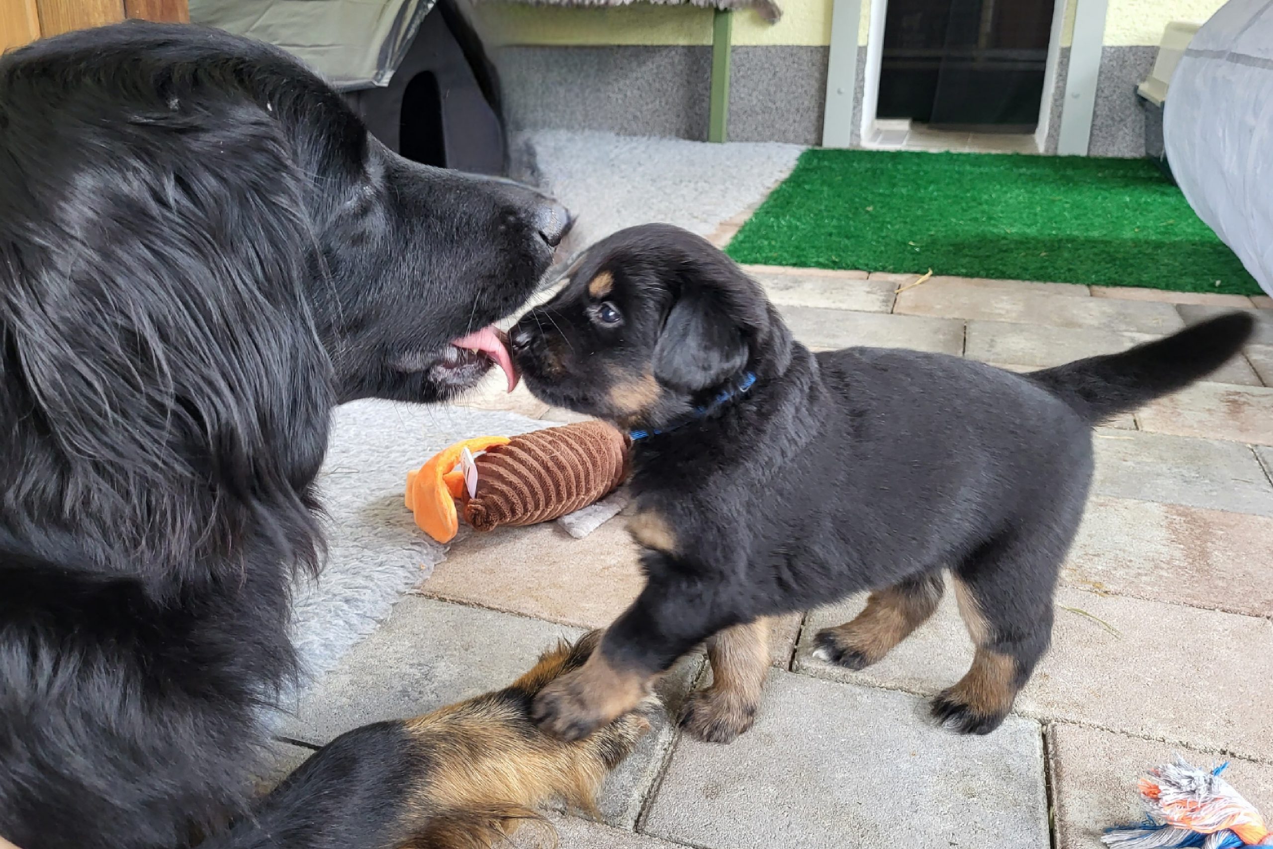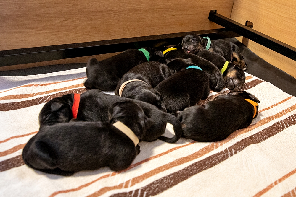 Unsere süßen kleinen (schon großen) Hovibabys sind heute genau 7 Wochen. Die Zeit rennt, jeder Tag ist gefüllt mit vielen Aktivitäten. Wir haben die letzte Woche ganz viel Einzelförderung gemacht. Entdecken, Spielen, Schnüffeln im Trainingsraum. Alle Minis sind offen, fröhlich, beutestark und sehr erkundungsfreudig. Einige Ausflüge standen auch schon am Programm. Manchmal ist es etwas laut im Auto, aber dann wird geschlafen. Mica hat immer noch Nachschlag nach dem Essen für die Babys bereit und kümmert sich sehr intensiv um ihre Kinder. Mit ihrer ruhigen und gelassenen Art kann sie sehr stressfrei mit ihnen umgehen. Sie muss nie schimpfen, ein kurzer Blick oder Knurrer reicht, wenn sie mal über die Stränge schlagen. Fast alle haben die 6kg bereits geknackt. Wir werden die letzten Tage mit den Babys sehr intensiv genießen.