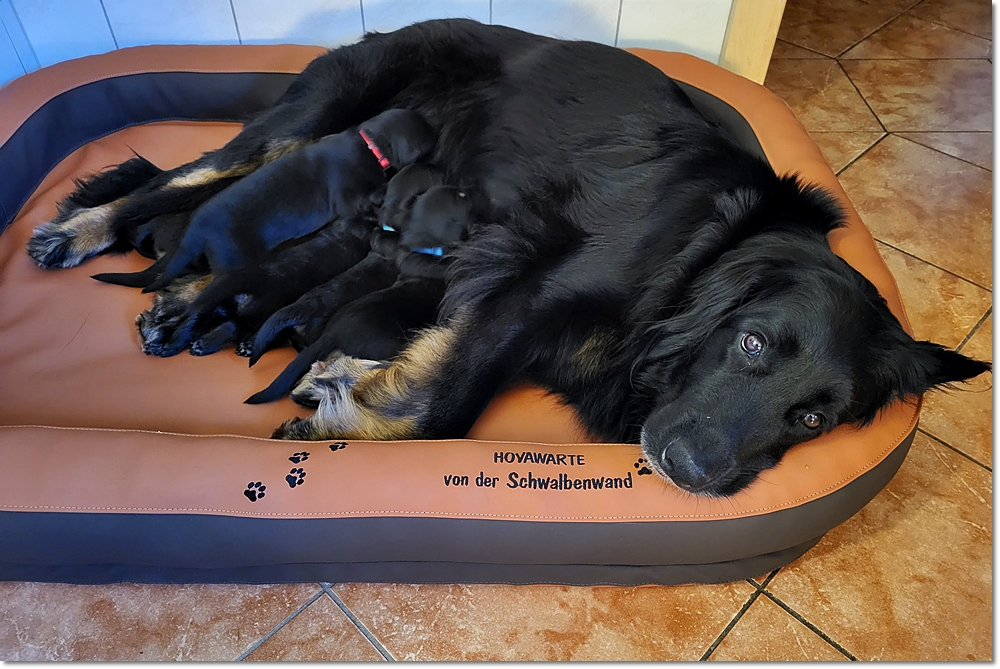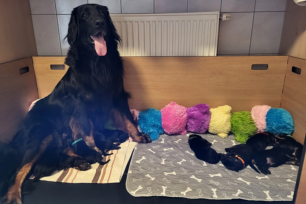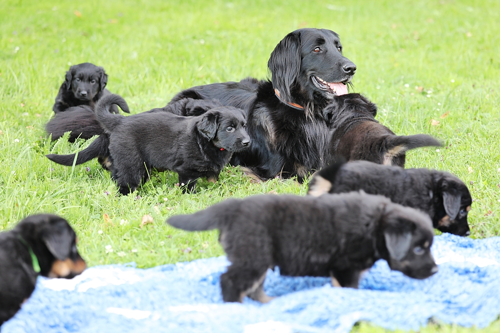 Unsere Babys sind 8 Wochen alt und bereit, in die große weite Welt zu ziehen. Eine intensive Zeit liegt hinter uns. Wir haben wundervolle Welpen, denen sowohl der Tierarzt als auch unsere Zuchtleitung beste Gesundheit, fehlerfreie Erscheinung und ein super Wesen bescheinigt haben. Wir werden jeden einzelnen schrecklich vermissen und freuen uns doch so sehr, dass sie in ihr neues Zuhause ziehen und ihre Menschen sehr glücklich machen werden. Alexa wird bei uns bleiben und hier sicher ein bisschen Stimmung in das Rudel bringen. Es lief alles so harmonisch ab, sodass wir überlegen, in zwei Jahren in das Abenteuer B‑Wurf zu gehen. Bis dahin schließen wir das Tagebuch hier und freuen uns auf die gemeinsame Zeit mit unseren Hovis.
