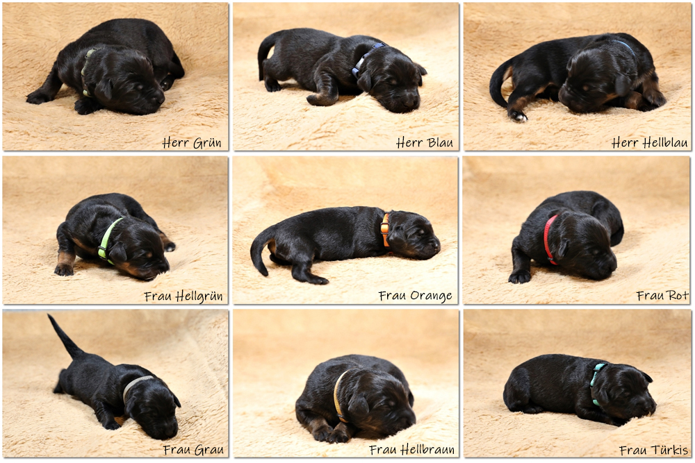 Gestern wurde die Wurfkiste geöffnet und die Minis + Mica haben jetzt mehr Platz. Sie gemießen es sehr und erkunden ihren Bereich. Völlig unerschrocken haben sie ihre Wurfkiste verlassen und sind mit Pauken und Trompeten in ihre neue kleine Welt gezogen. Sie spielen jetzt schon miteinander und interessieren sich immer mehr für ihre Umwelt. Gestern haben sie mich bewusst wahr genommen und sich angefangen zu freuen. Wie nett, wenn sie schwanzwackelnd und auch so noch wachelig auf einen drauf zu kommen. Heute haben sie bereits versucht zu zergeln an der Jacke, obwohl sie noch keine Zähne haben. Sie sind wirklich lustig drauf, nur Einzelbilder bekommen wir nur im Milchkoma hin und dann sind die Augen natürlich geschlossen. Dabei schauen sie schon so neugierig in die Weltgeschichte.