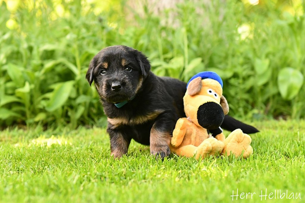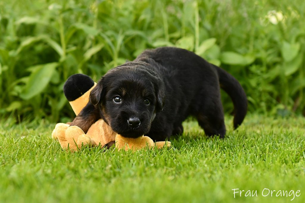 Hier geht jetzt die Post ab. Die Welpen haben einen großen Bewegungsbedarf und wollen kämpfen, Beute machen, erkunden und was erleben. Der große Auslauf ist frei gegeben und sie rennen mit Begeisterung im Kreis um den Nußbaum und sind als wirklich kreative Gartenprofis unterwegs. Sie fressen in Lichtgeschwindigkeit alles was wir ihnen anbieten und machen schon ganz schön großer Haufen. Diese landen erfreulicher Weise in der Nacht fast ausnahmslos im Heuklo, was uns das Putzen wirklich erleichtert. Mica geht immer noch regelmäßig rein und präsentiert den ‘Nachtisch’. Ansonsten liegt sie gerne bei ihrem Welpen spielt und schmust mit ihnen und ist einfach nur eine ganz glückliche Mami. Einzelfotos gibt es auch wieder und wir sind in alle schrecklich verliebt.