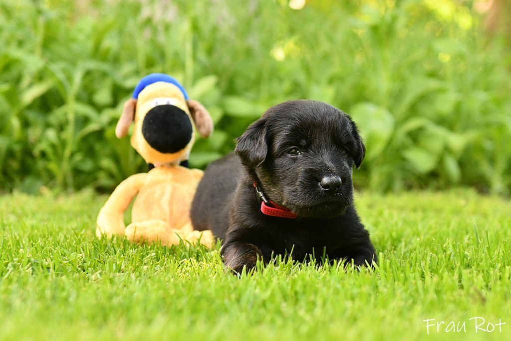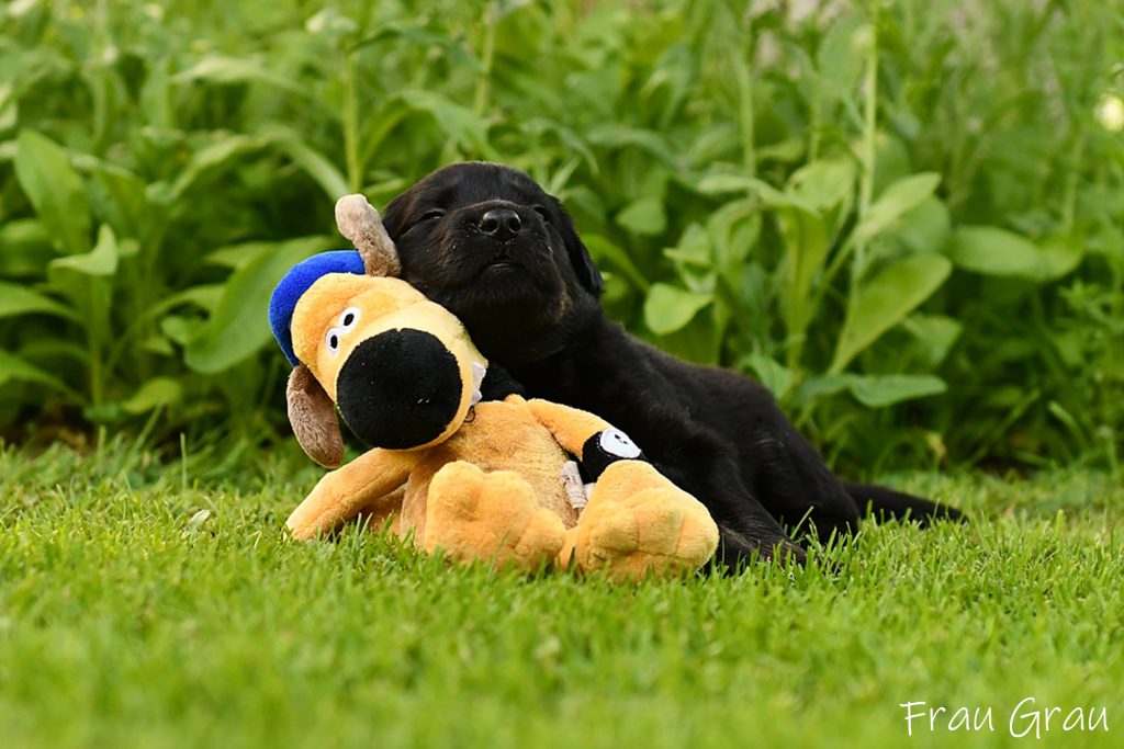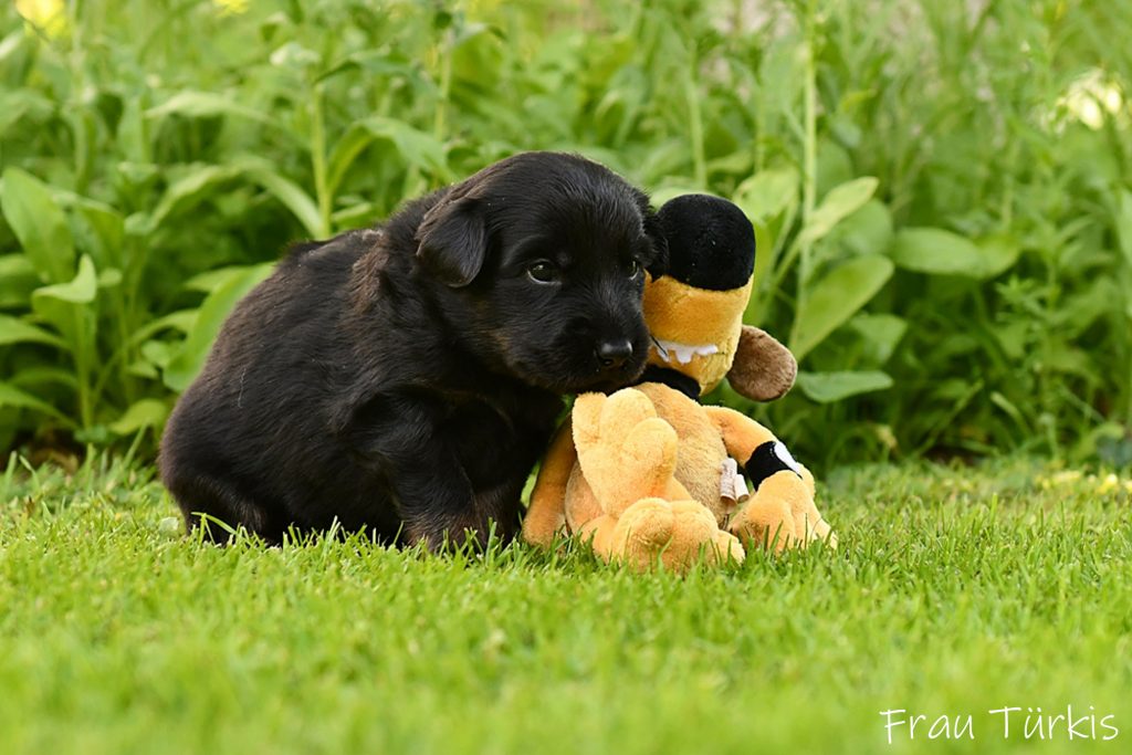 Mama Mica nimmt sich jetzt gerne eine Auszeit. Dabei klaut sie den Welpen auch regelmäßig das Spielzeug. Aber sie haben je zum Glück genug und dieses wird jetzt aktiv in Beschlag genommen. Die Entwicklung geht rasant, sie sind richtige kleine Hunde geworden und schnell können sie schon sein. Fressen geht prima und sie haben immer Hunger. 7 Minis haben bereits die 3kg geknackt, 2 sind kurz davor. Wir erweiteren jetzt Schritt für die Schritt den Auslauf mit neuen Dingen, die sie entdecken können. Und neugierig sind sie alle, es macht Spaß zuzuschauen. Wir haben wieder entzückende Einzelfotos gemacht. Die Zeit ist sehr intensiv und es wird immer aktiver hier. Wir lieben die Minis auf alle Fälle alle sehr.