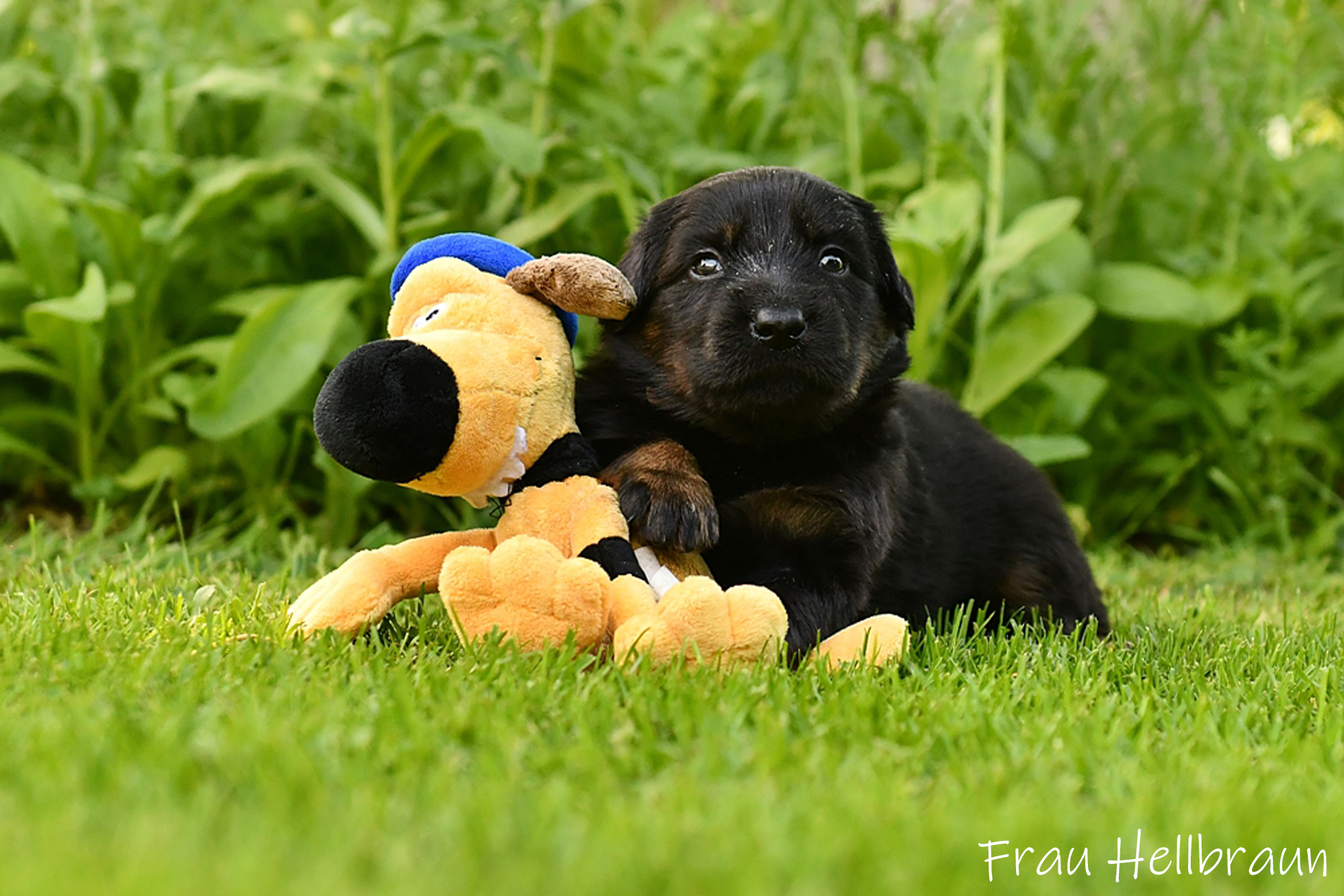 Hier geht jetzt die Post ab. Die Welpen haben einen großen Bewegungsbedarf und wollen kämpfen, Beute machen, erkunden und was erleben. Der große Auslauf ist frei gegeben und sie rennen mit Begeisterung im Kreis um den Nußbaum und sind als wirklich kreative Gartenprofis unterwegs. Sie fressen in Lichtgeschwindigkeit alles was wir ihnen anbieten und machen schon ganz schön großer Haufen. Diese landen erfreulicher Weise in der Nacht fast ausnahmslos im Heuklo, was uns das Putzen wirklich erleichtert. Mica geht immer noch regelmäßig rein und präsentiert den ‘Nachtisch’. Ansonsten liegt sie gerne bei ihrem Welpen spielt und schmust mit ihnen und ist einfach nur eine ganz glückliche Mami. Einzelfotos gibt es auch wieder und wir sind in alle schrecklich verliebt.